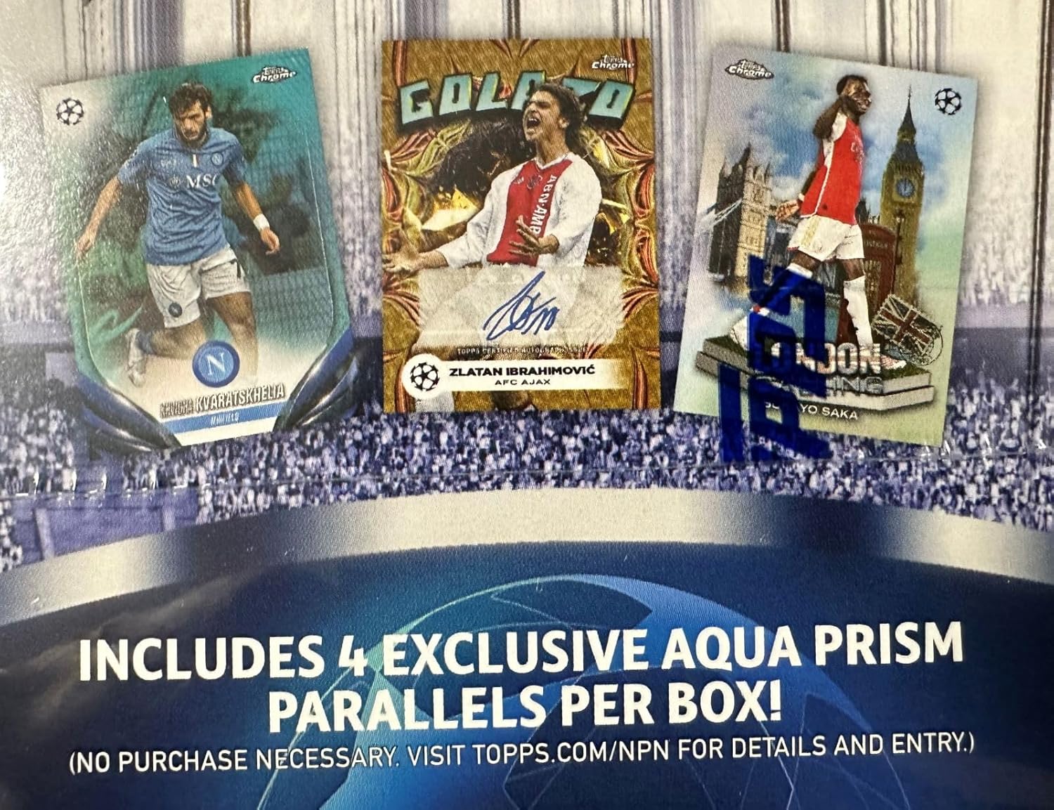 This is a Topps Chrome Series 2023 2024 UEFA Champions League Soccer Collection Factory Sealed Blaster Box. Each box contains 7 packs of 4 cards for a total of 28 cards per box including 4 Blaster EXCLUSIVE AQUA PRISM Parallels per box! The 2023 2024 Topps Chrome UEFA Club Competitions Soccer Value Box is a must-have for any soccer card collector or enthusiast. This box contains a curated selection of high-quality soccer cards featuring players from various club competitions around the world. With a sleek and modern chrome finish, these cards are not only visually stunning but also designed to withstand the test of time. Whether you're a seasoned collector or just starting out, this value box offers an excellent opportunity to expand your collection with some of the most sought-after soccer cards. Immerse yourself in the excitement of club competitions and capture the essence of your favorite teams and players through these meticulously crafted cards. Don't miss out on this chance to own a piece of soccer history and elevate your collection to new heights.