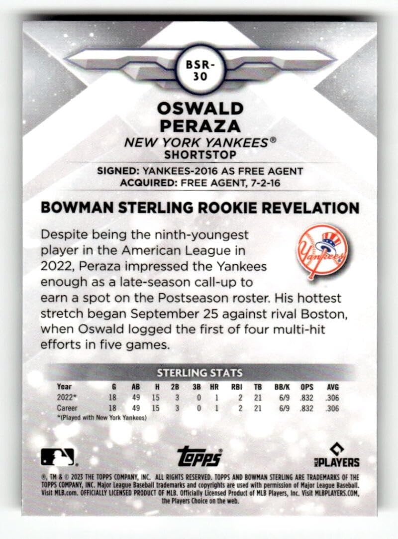 2023 Bowman Sterling Rookies #BSR-30 Oswald Peraza RC Rookie New York Yankees MLB Baseball Trading Card