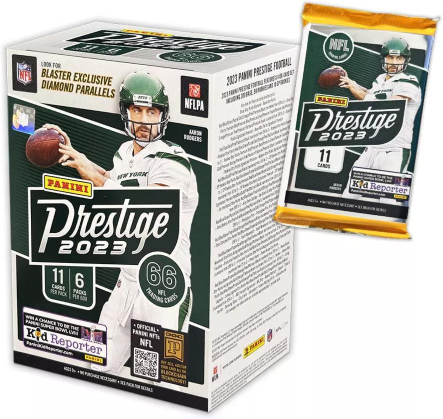 Panini presents the 2023 NFL Prestige Football Trading Card Blaster Box. Led by a large base set with rookie short prints (SP) and on-card Draft Day Signatures cards, 2023 Panini Prestige Football returns for another NFL season. The 2023 Panini Prestige Football checklist keeps the 400-card base set intact, supplying 300 veterans, 90 rookies and 10 short-printed rookies. Several parallels in the Xtra Points lineup are exclusives, including Xtra Points Diamond (Blaster), Xtra Points Galaxy (Hobby H2), Xtra Points Hyper (Mega Box), and Xtra Points Sunburst (Fat Pack). Providing plenty of variety, collectors can find 18 different insert sets in 2023 Panini Prestige Football.