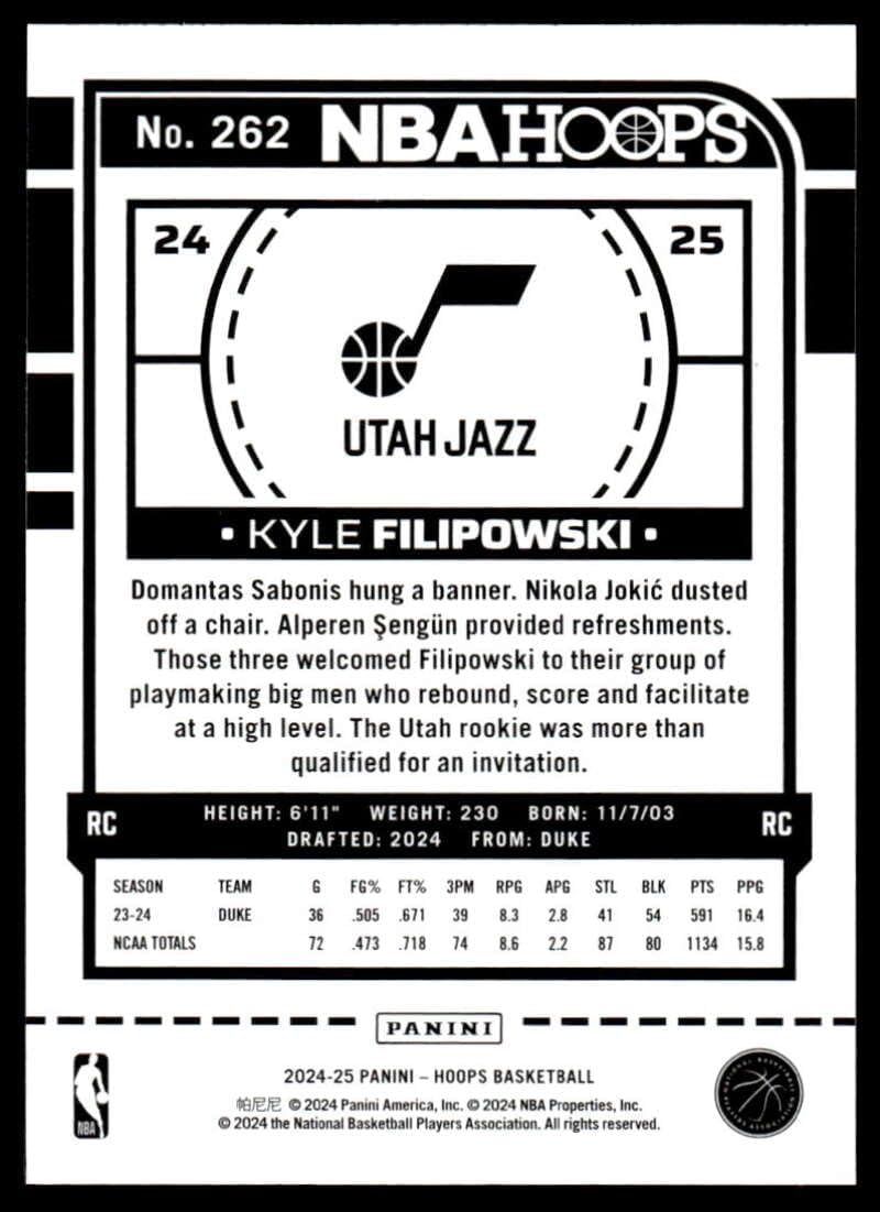 2024-25 Hoops #262 Kyle Filipowski RC Rookie Utah Jazz NBA Basketball Base Trading Card