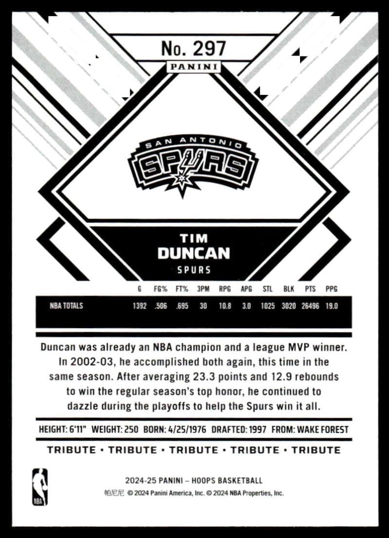 2024-25 Hoops #297 Tim Duncan Tribute San Antonio Spurs NBA Basketball Base Trading Card