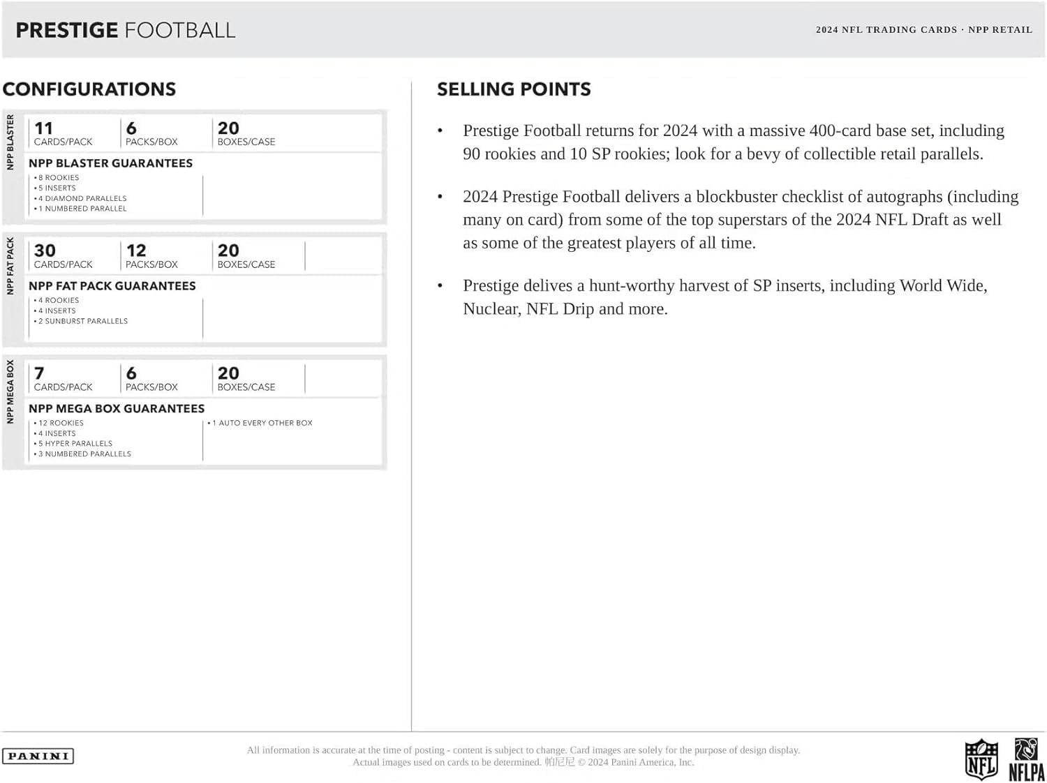 Prestige Football returns for 2024 with a massive 400-card base set, including 90 rookies and 10 SP rookies; look for a bevy of collectible retail parallels.