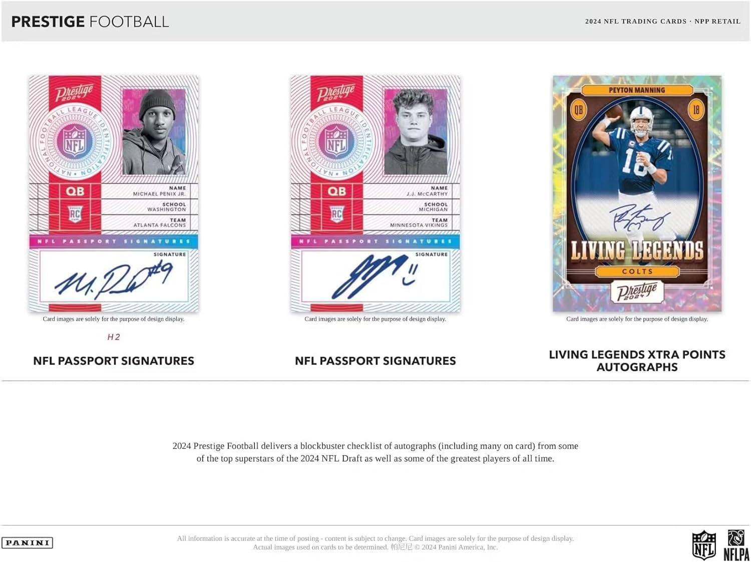 AUTOGRAPHS: 2024 Prestige Football delivers a blockbuster checklist of autographs (including many on card) from some of the top superstars of the 2024 NFL Draft as well as some of the greatest players of all time.