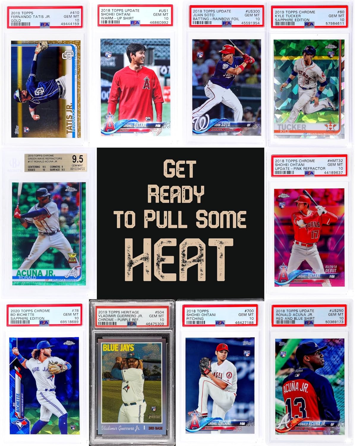 Embark on an exhilarating journey into the world of baseball card collecting with the Slabs of Heat Baseball Card Collection Builder (or Starter Set!) Specially curated for both avid collectors and newcomers, this unique gift set is your gateway to owning a piece of baseball history and adding stars to your collection like Shohei Ohtani, Ronald Acuna Jr, Mike Trout, Aaron Judge, Fernando Tatis Jr, Mookie Betts, Juan Soto, Hall of Fame Legends, etc.