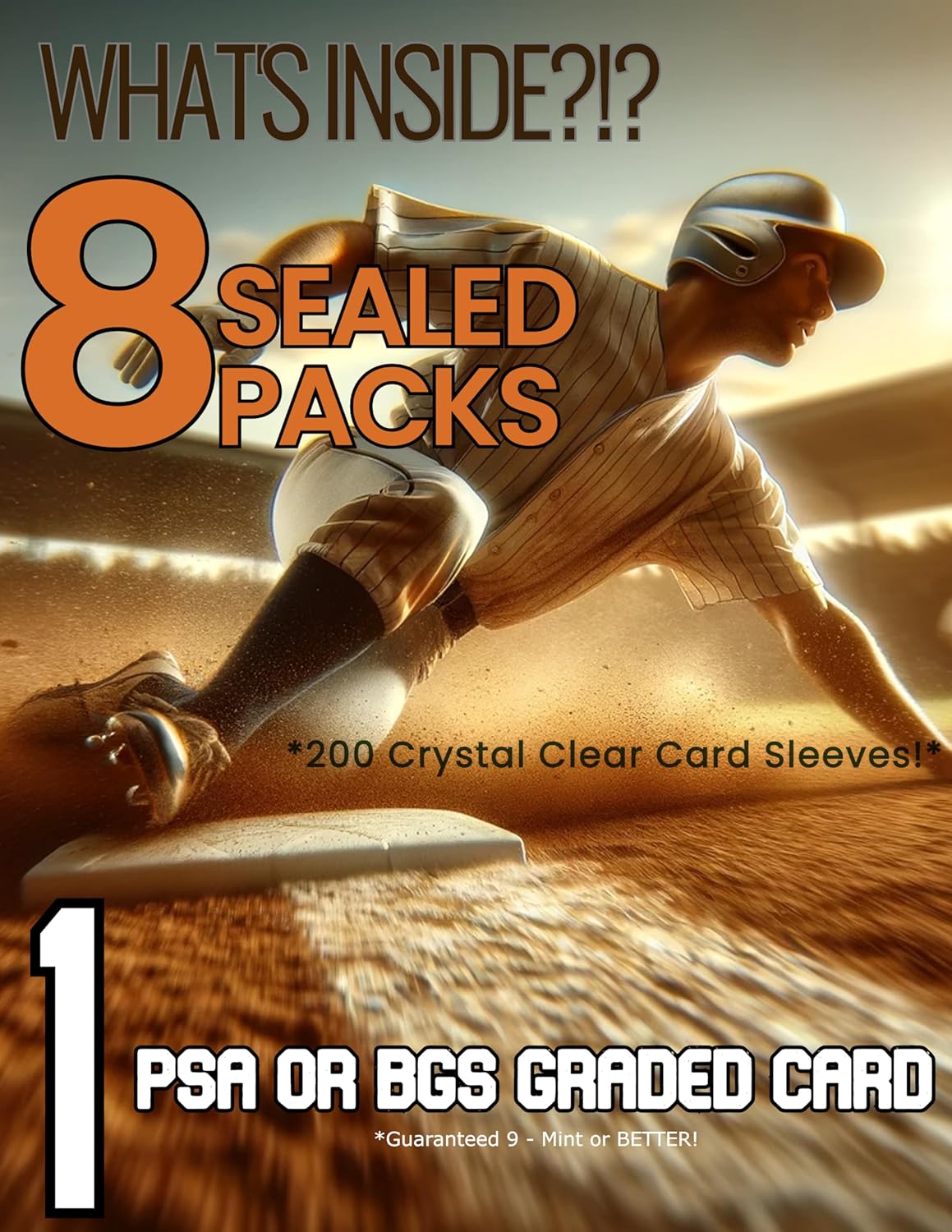 Epic Baseball Gift Box & Collection Starter Set1 Graded Card + 8 Sealed Packs of Modern Licensed CardsPSA/BGS Graded Card 10, 9.5 or 9 & 200 SleevesPossible AutographsSlabs of Heat