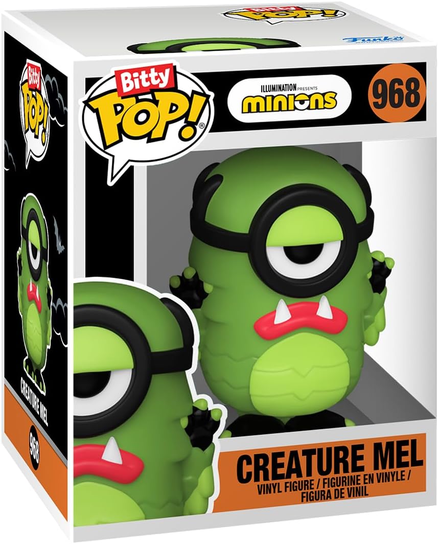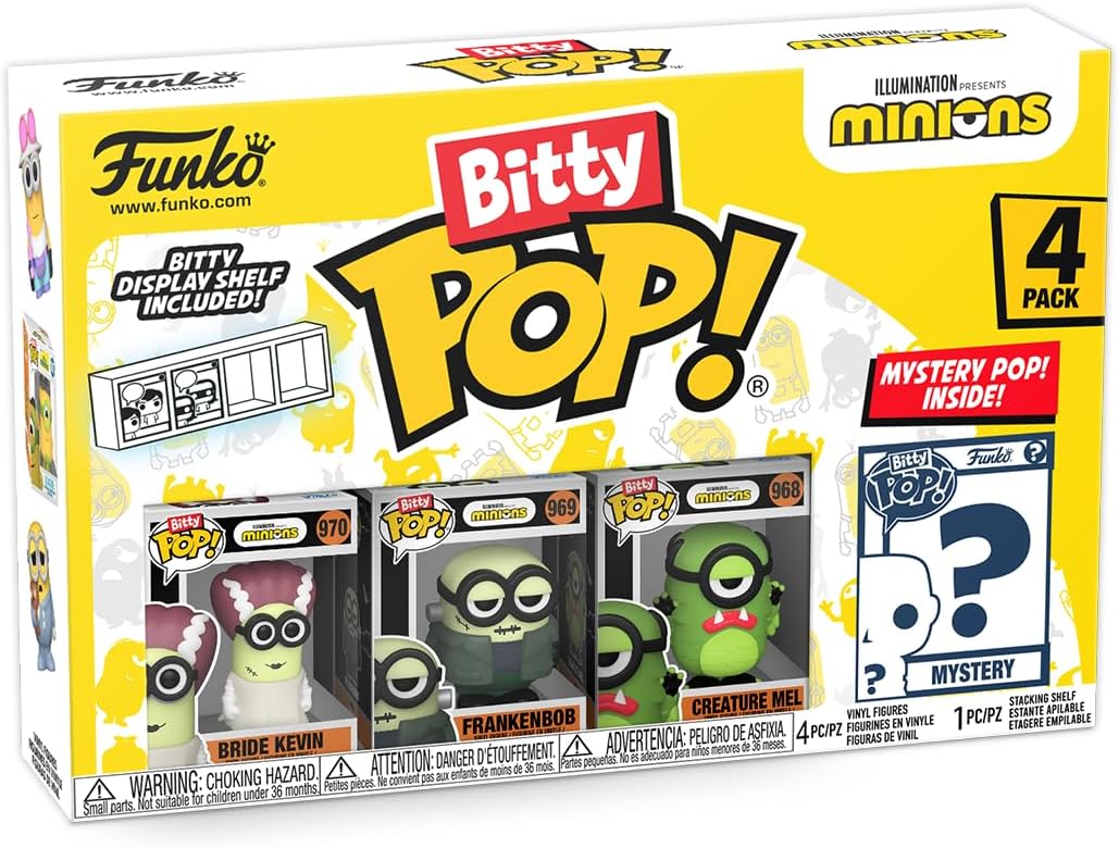 Your favorite Pops! have been shrunk into Bitty Pops! Expand your Minions collection with this assortment of Bitty Pop! figures featuring your most beloved evil minions! This 4-pack includes Bitty Pop! Frankenbob, Bitty Pop! Bride Kevin, Bitty Pop! Creature Mel, and a mystery Bitty Pop! figure. The possible mystery Bitty Pops! are Hyper Rare (1/6) King Bob, Hyper Rare (1/6) Pet Rock Otto, Rare (1/3) Mummy Stuart, and Rare (1/3) Fluffy. Bitty Pops! are packaged in hard acrylic cases with detachable bottom lids. Detachable bottom lids double as acrylic bases, to which the Bitty Pop! figures are adhered. Sort and arrange your Bitty Pops! with the included display case! Acrylic display cases are stackable and hold four Bitty Pop! figures each. Vinyl figures are approximately 0.9-inches tall. Four figures per single package purchase. Warning: Choking Hazard. Collectibles are small. Not for children under the age of 3 years old. Item selection is random, as each piece is in blind packaging. We cannot accept requests for specific items. You may receive duplicate figures.