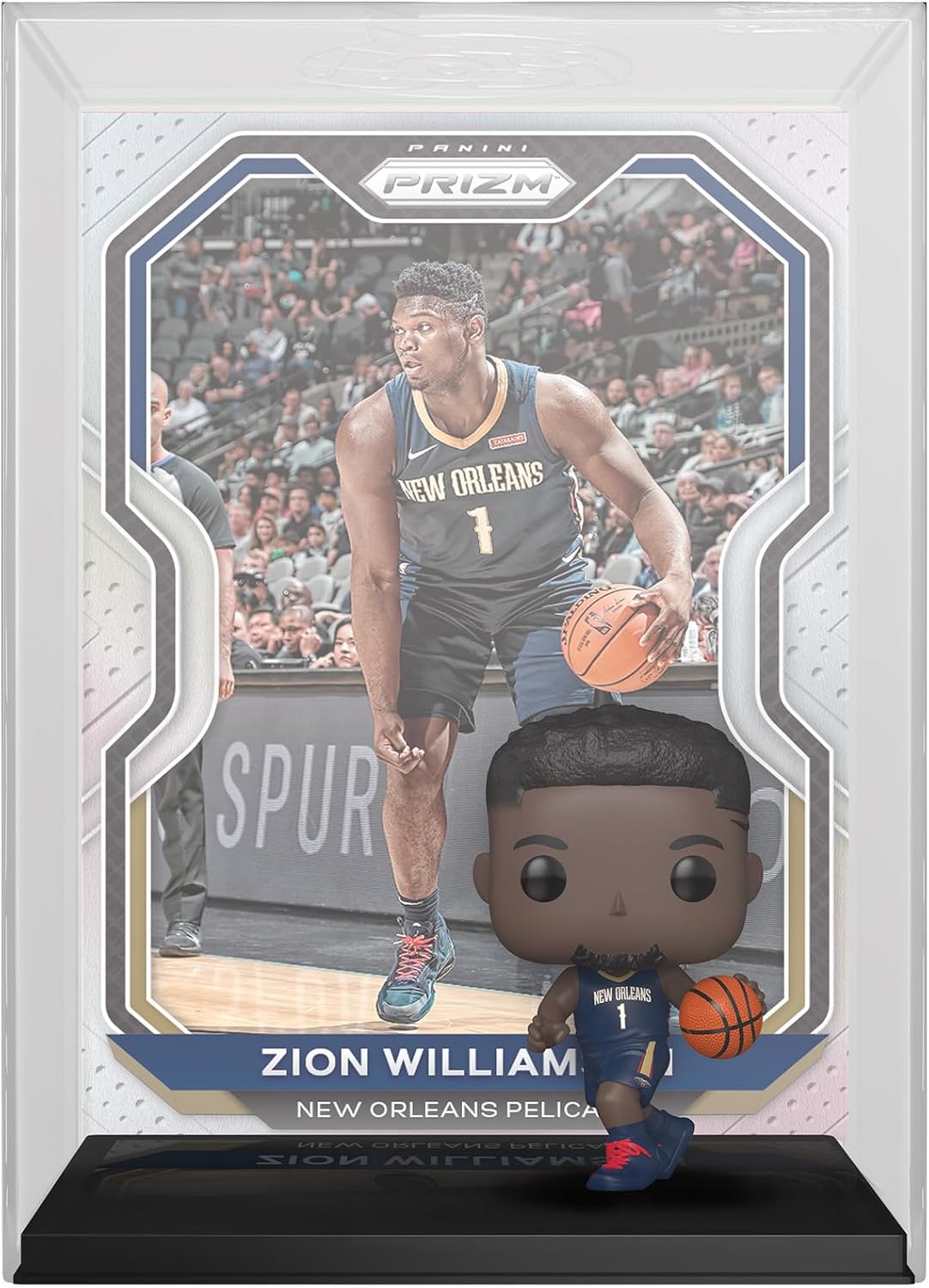 - The collectible features a Pop! Zion Williamson figure, wearing his dark blue New Orleans Pelicans uniform, which matches the included trading card art, and comes prepackaged in a protective case that can be hung on your wall!