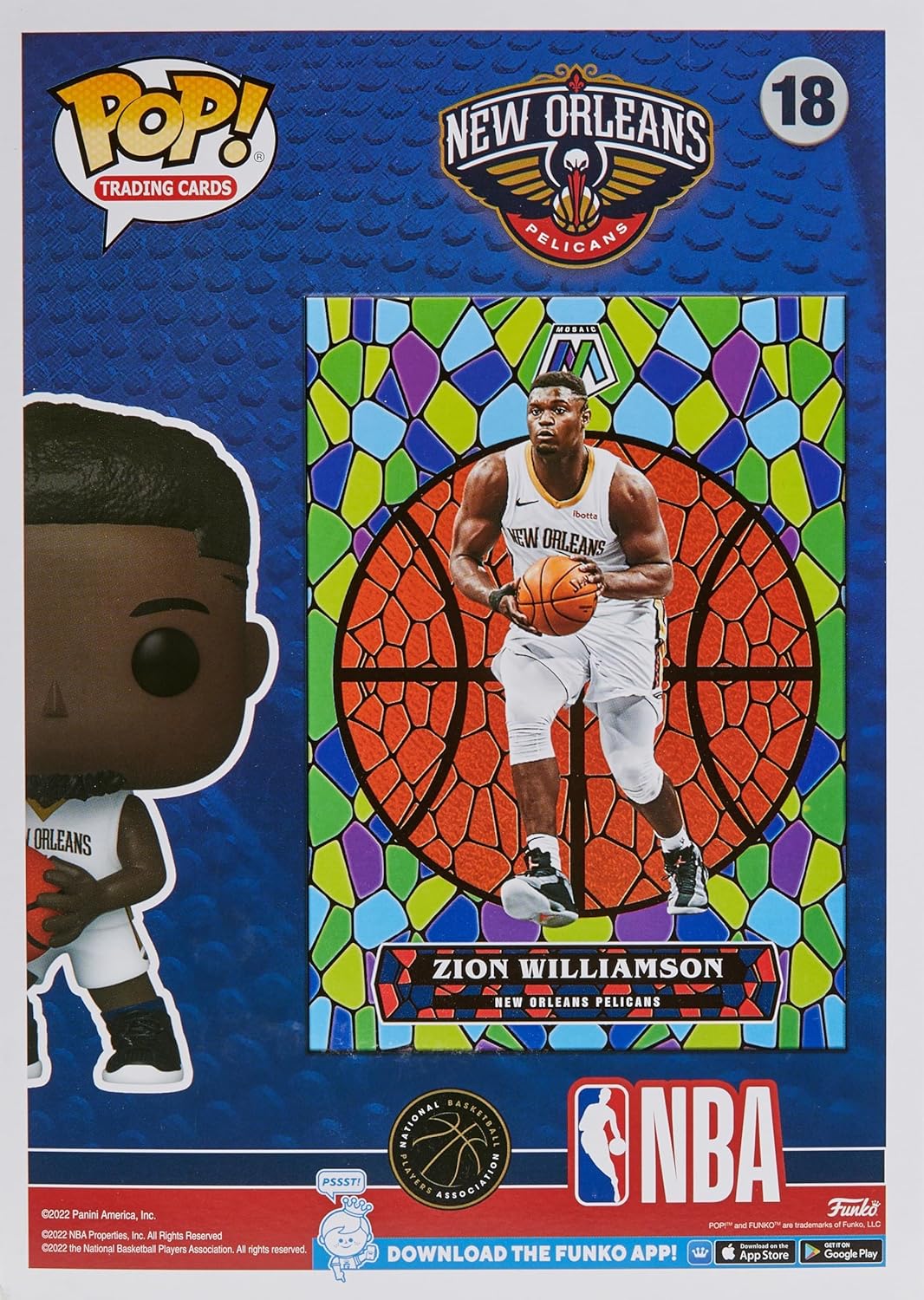 - The collectible features a Pop! Zion Williamson figure, wearing his white New Orleans Pelicans uniform, which matches the included Panini Mosaic trading card art.