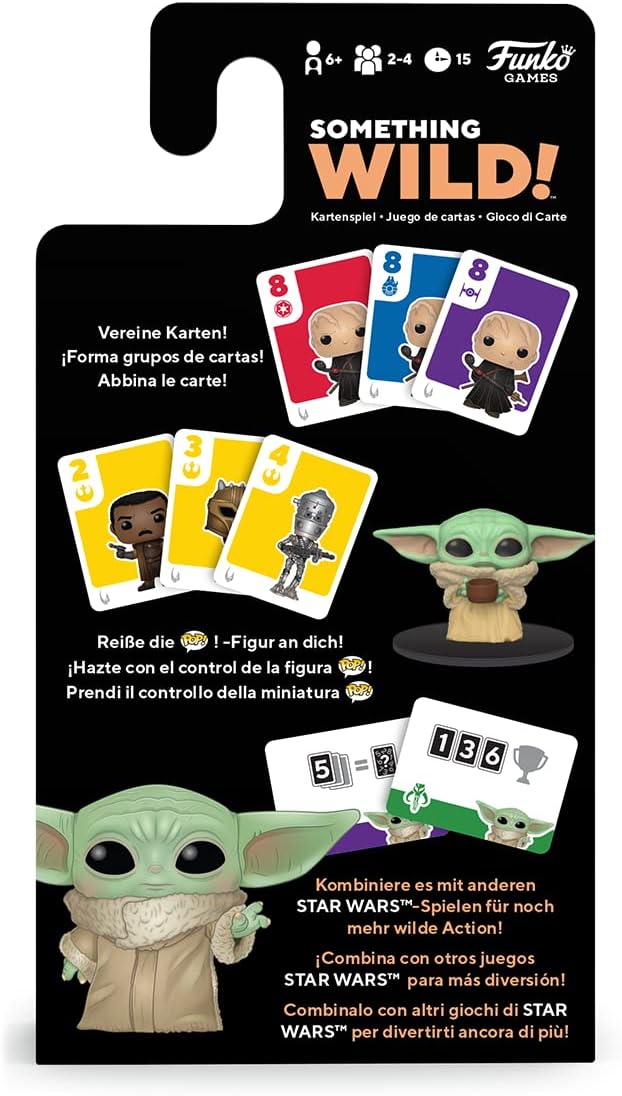 Something Wild! Star Wars The Mandalorian – Grogu™ Game “Something Wild! Star Wars: The Mandalorian” is a fast-paced, light card game for the whole family! Featuring a collectible Grogu™! figure, as well as your favorite characters from the world of The Mandalorian. Power Cards add a fun twist to this new-classic, set-making card game. Combine multiple games to add more character cards, more Pop! figures, and more powers to your game! Interesting Gameplay Features • One Pocket Pop! Grogu™ figure that lets you use Powers! • Nine of your favorite Star Wars: The Mandalorian characters in full color card art • Power Cards help you complete sets in new ways! • Use Powers to take cards, or even Grogu™ figure, away from your opponents!