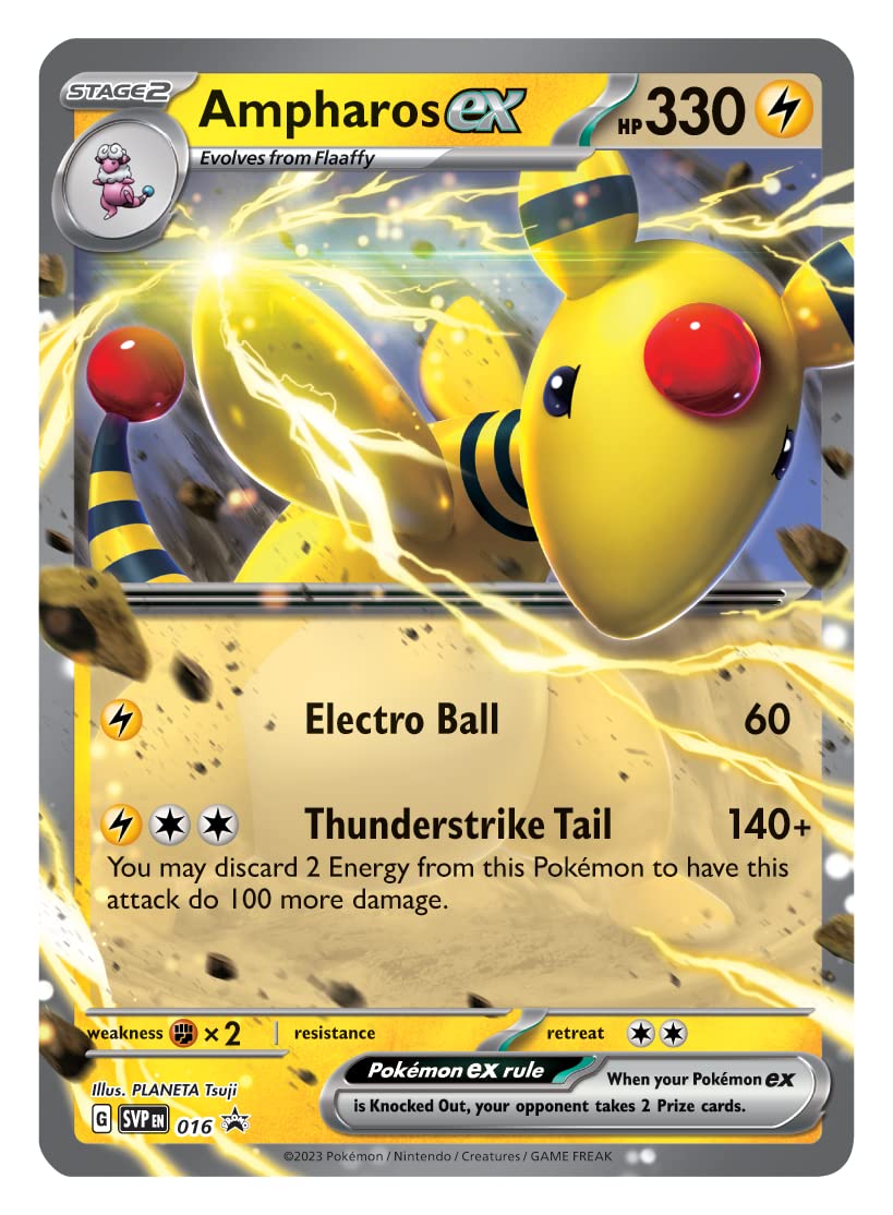 Ampharos ex Charges Up & Lets Loose! Powerful Pokemon ex are ready to charge onto the battlefield in the new Pokemon TCG: ex Battle Decks! Includes 1 ready-to-play 60-card deck featuring Ampharos ex, 3 reference cards, 1 rules booklet, 1 single-player playmat, 1 set of damage counters, and 1 large metallic coin. You will also get 1 deck box, 1 strategy sheet, and 1 code card to play this deck online in Pokemon TCG Live! This ex Battle Deck has everything you need to get you started and battle your opponents right away!