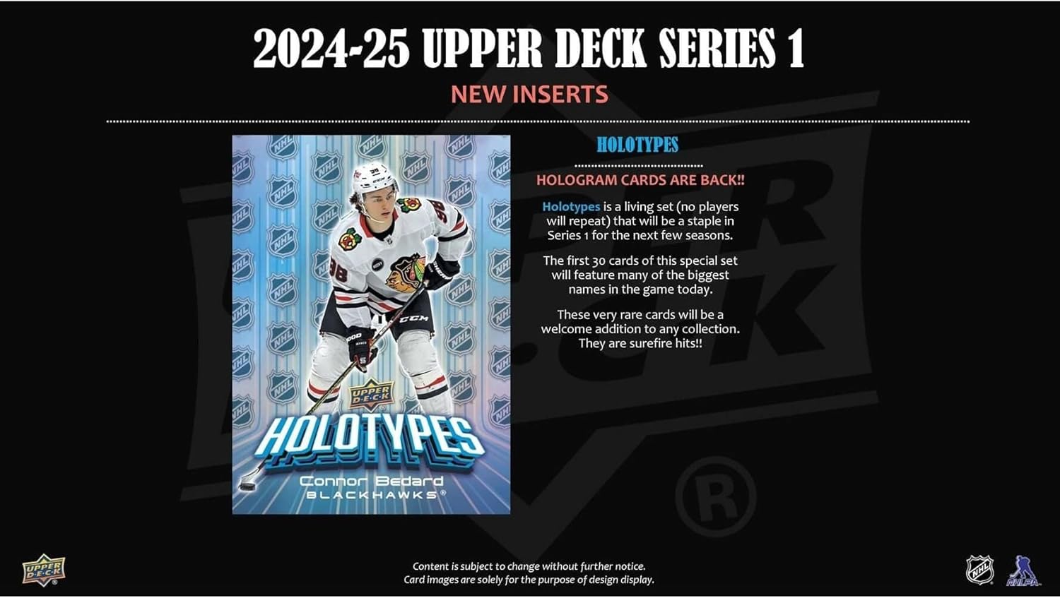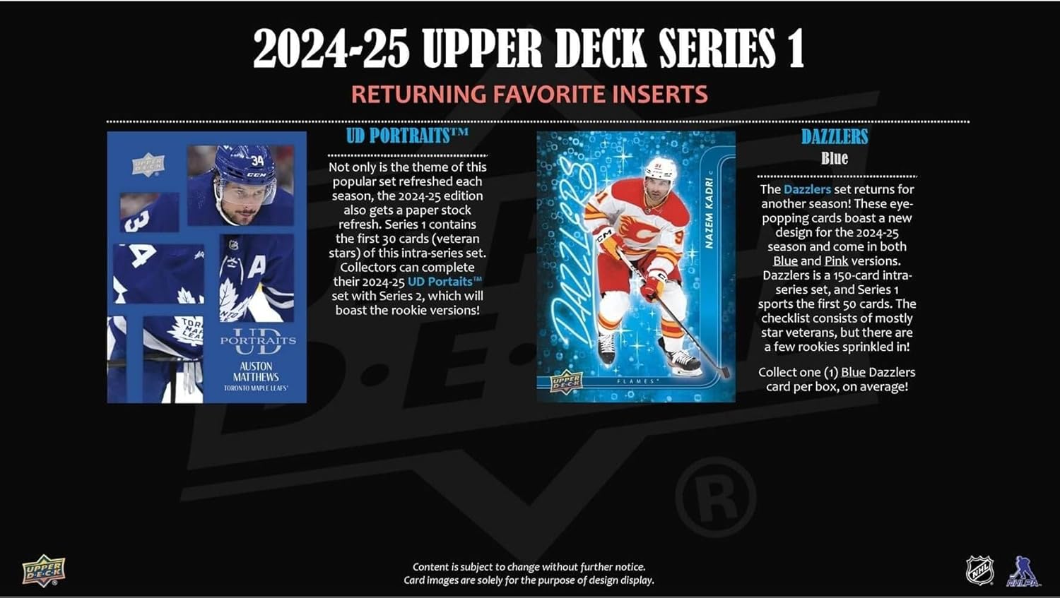 Series 1 sports the first 250 cards of the 2024-25 Upper Deck Base Set. Annually, the Upper Deck Base Set is the most widely-collected Base Set in hockey. It includes 198 veteran cards, 49 Young Guns rookie cards and three checklist cards. The iconic Young Guns are the most anticipated rookie cards of the season.